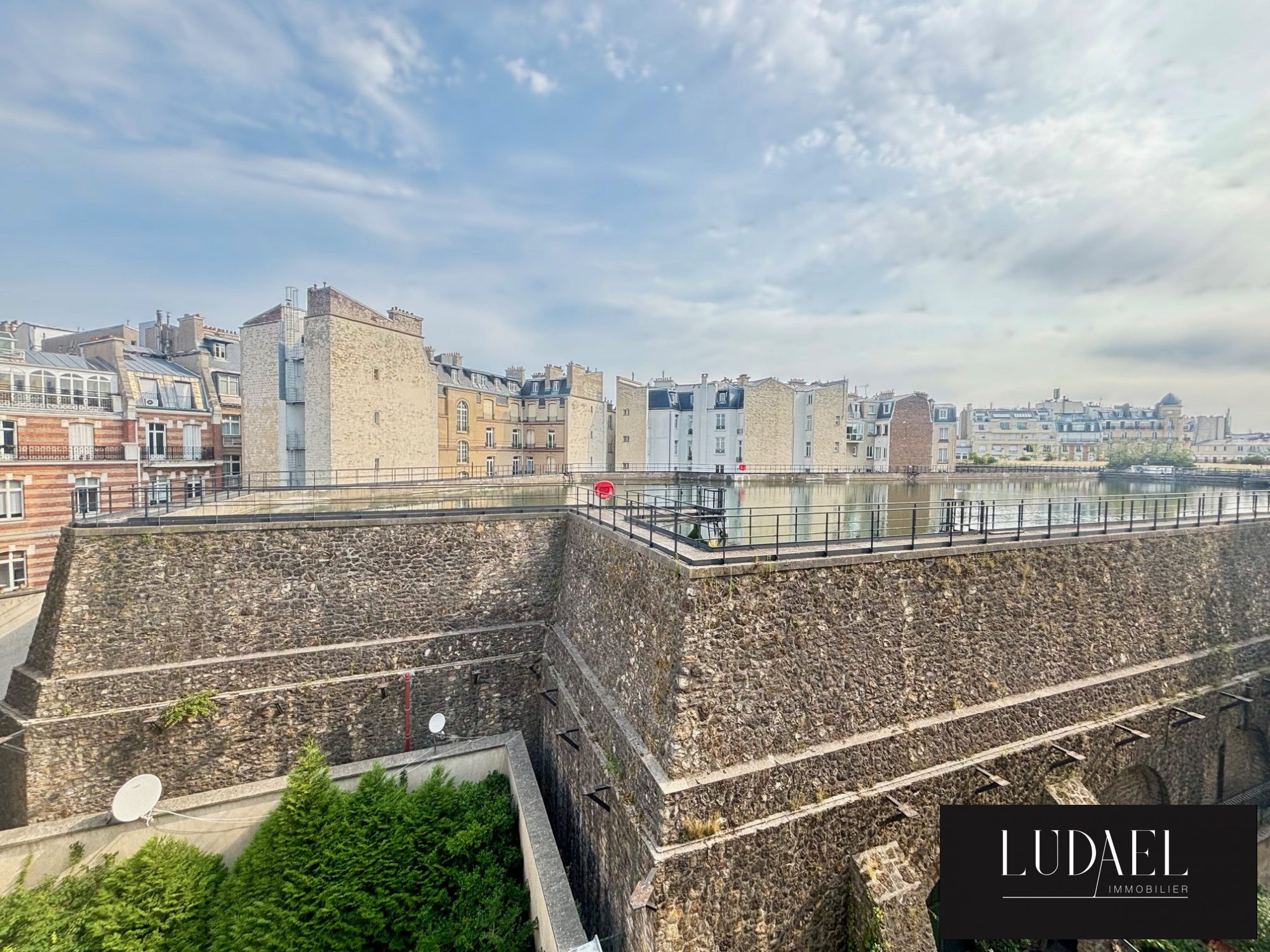 L'appartement dispose de deux grandes chambres, dont une donnant directement sur les réservoirs d'eau de Paris, garantissant un calme absolu. La salle de bains est équipée d'une baignoire ainsi que d'un coin buanderie avec un lave-linge et sèche-linge. Un WC séparé complète l'ensemble.