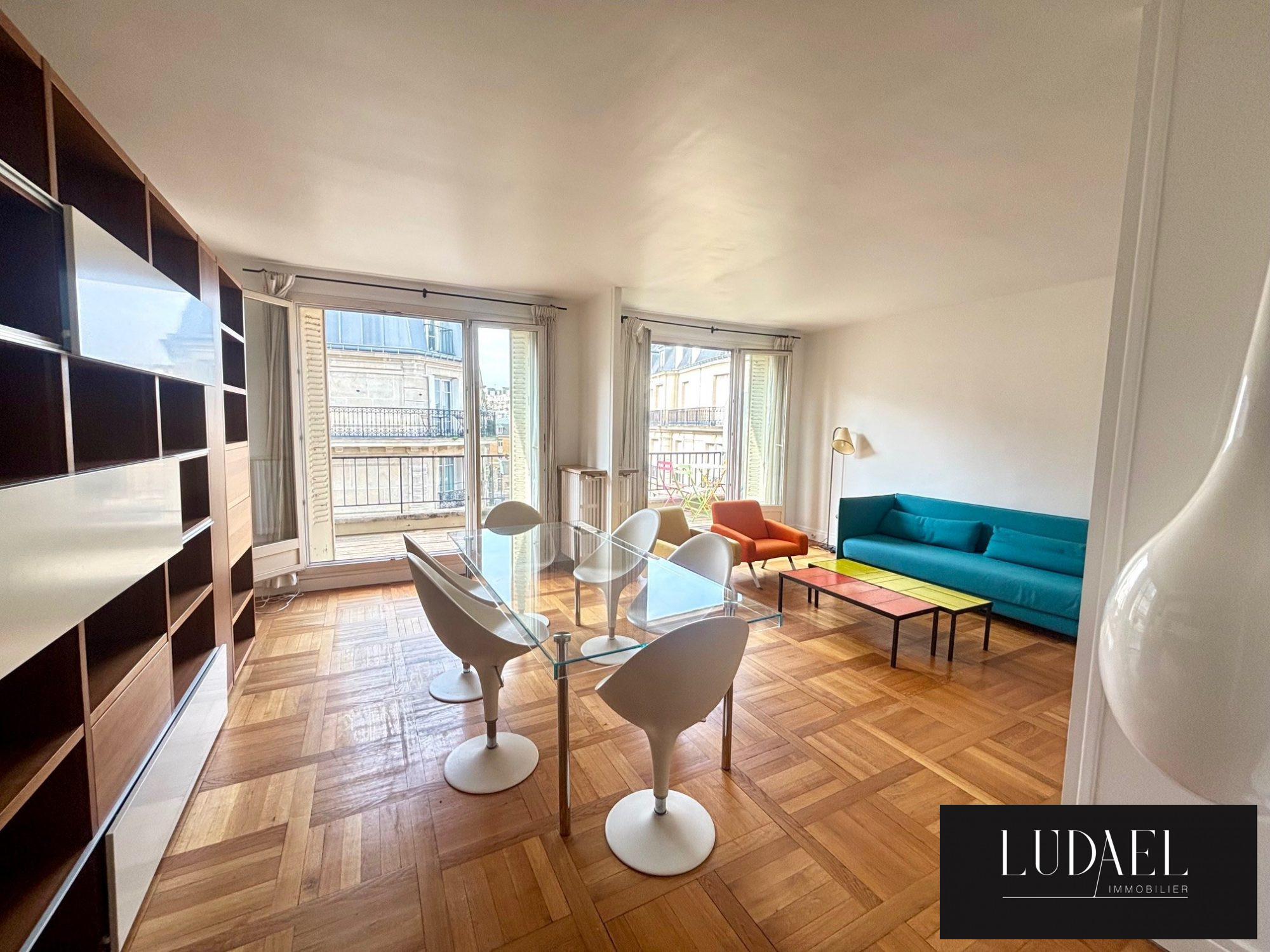 LUDAEL Immobilier vous propose à la location meublée ce superbe appartement avec balcon (17m²) rénové de 105 m², situé rue Copernic dans le 16e arrondissement de Paris, au 5e étage avec ascenseur d'un immeuble de standing.